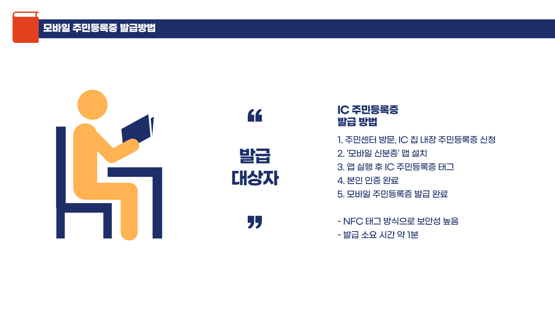 - 주민센터 방문 → IC 칩 내장된 주민등록증 신청