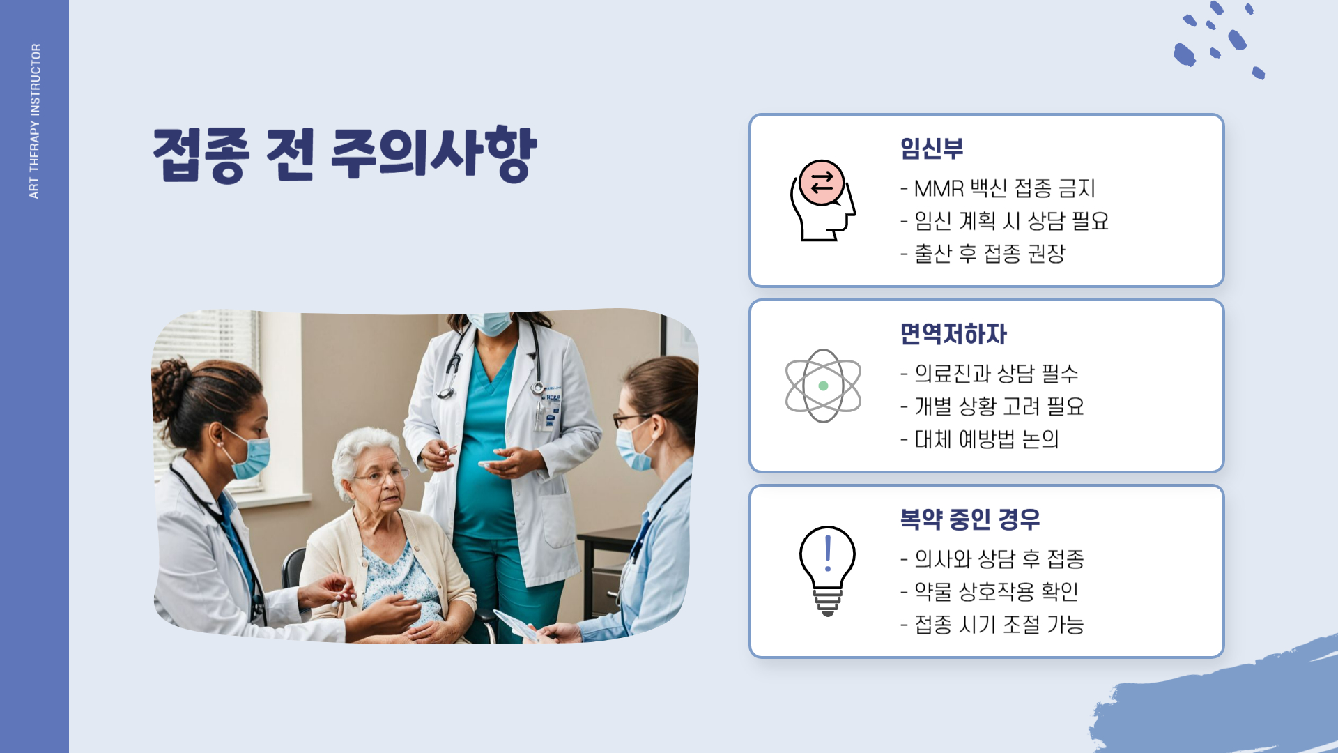 - 임신부: MMR 백신은 생백신이므로 임신 중에는 접종 금지
