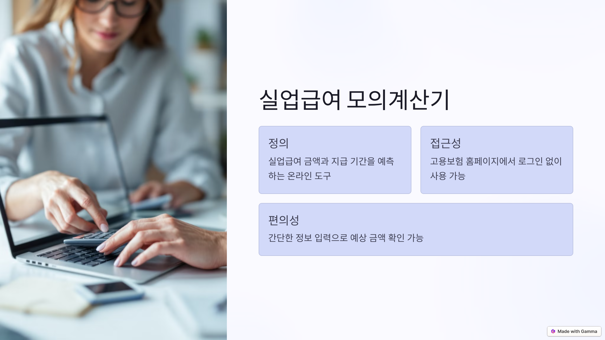고용보험 공식 홈페이지에서 제공하며, 로그인 없이도 간단한 정보 입력만으로 예상 금액을 확인할 수 있어요!