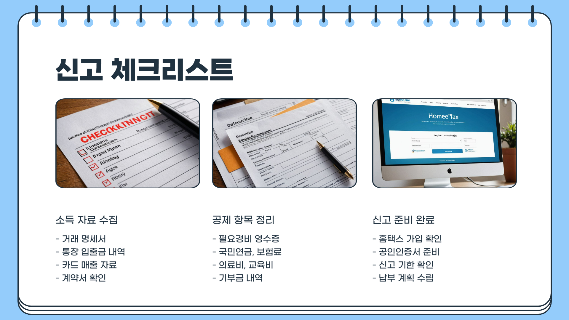 - 필수자료: 소득자료, 지출자료, 공제 항목 자료 등