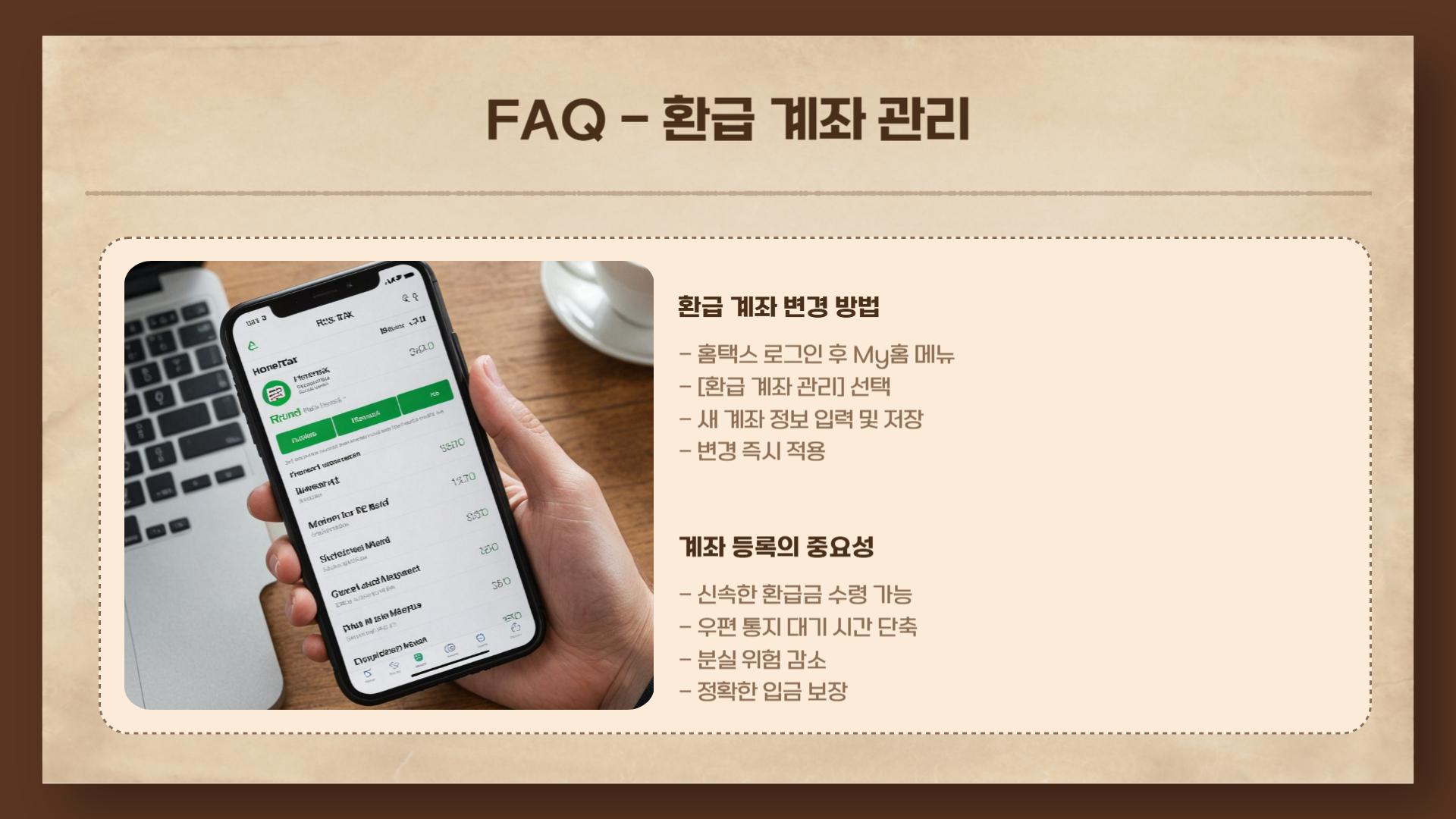 - 홈택스 로그인 → My홈 → [환급 계좌 관리] 메뉴에서 변경 가능