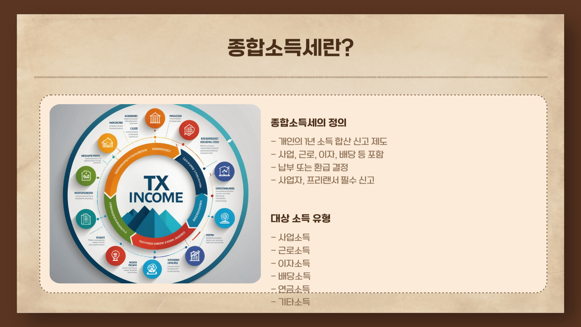 종합소득세란 개인이 1년 동안 벌어들인 다양한 소득(사업, 근로, 이자, 배당 등)을 합산하여 신고하고 세금을 납부하거나 환급받는 제도입니다.