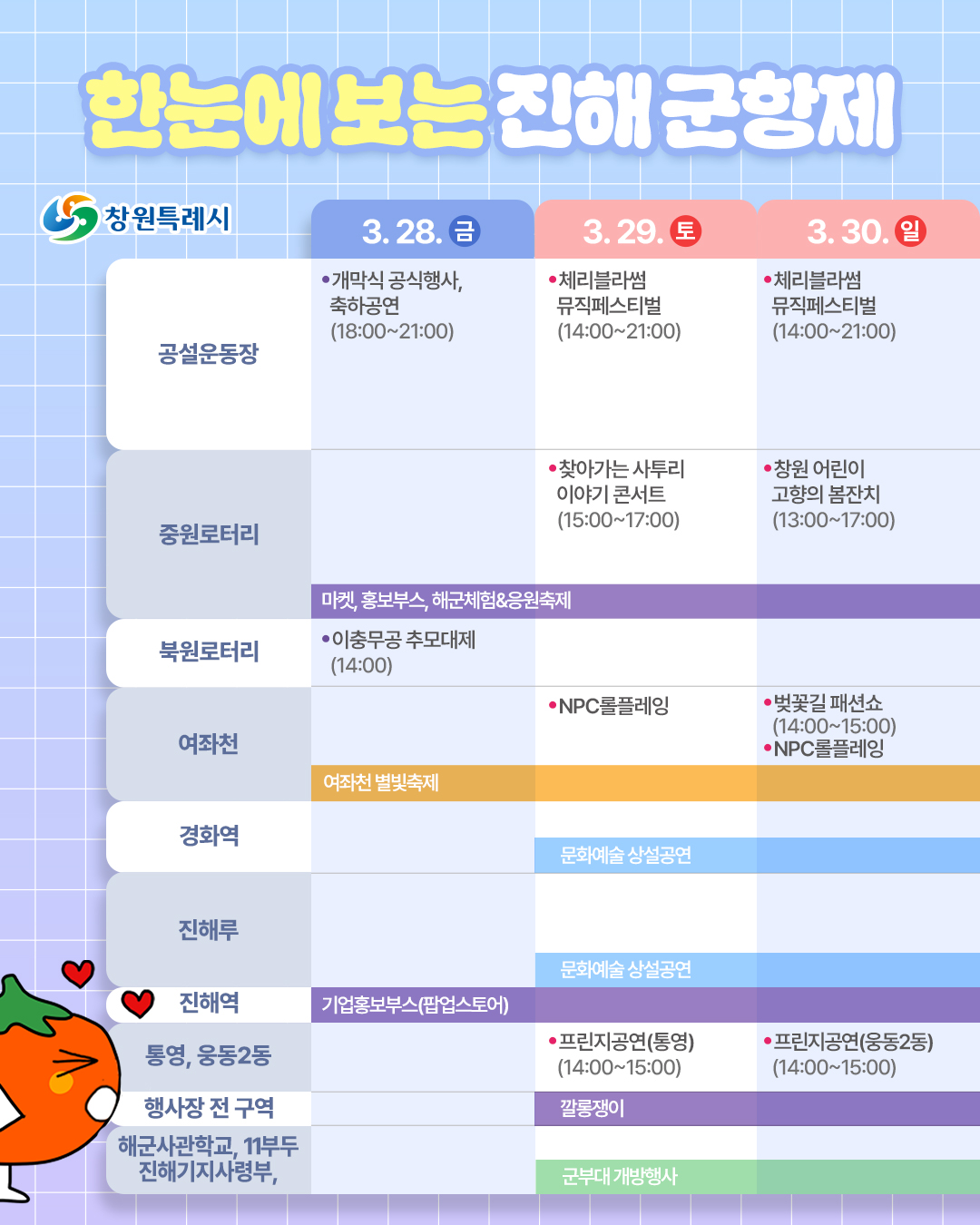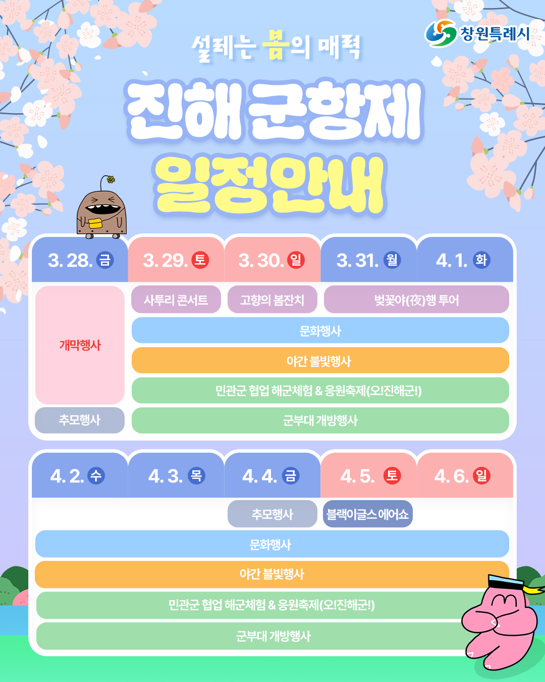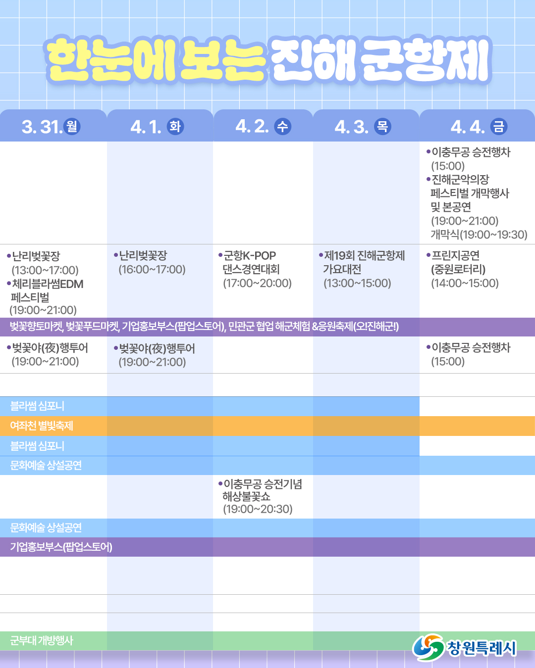 • 군항제 일정: 3월 29일(토) ~ 4월 6일(일)