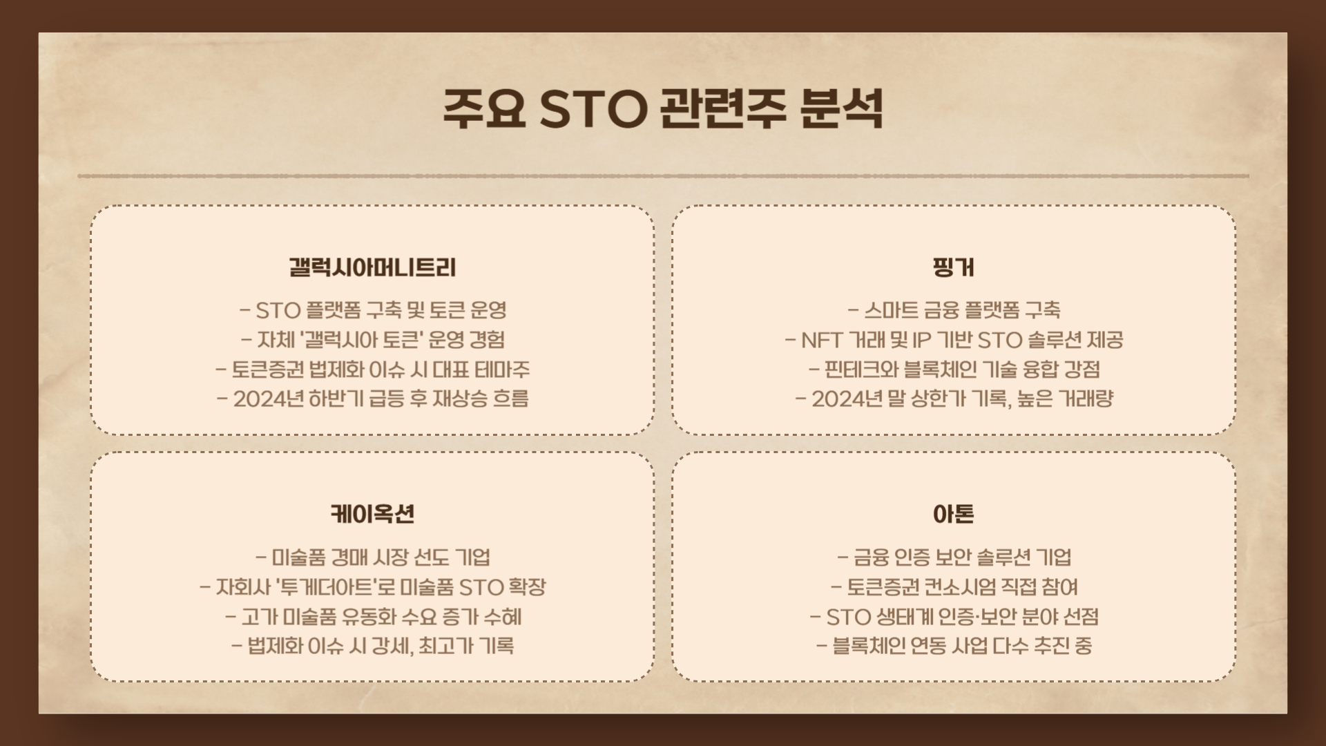 | 갤럭시아머니트리 | 자회사 통해 토큰증권 플랫폼 운영, 자체 토큰 발행 | 2024년 8월 법제화 기대감 급등 |
