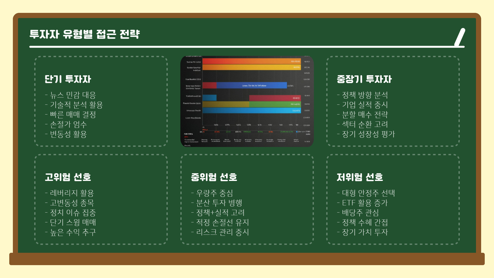 - 정치 테마주는 이슈 발생 시 급등, 해소 시 급락하는 특징이 있어 단기 매매가 유리합니다.